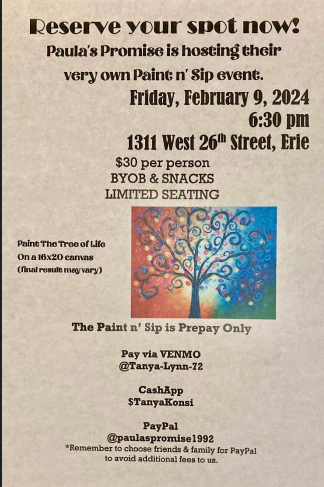 Grab a friend, drinks and snacks and come join us for a night of laughter and fun. Instructor guided painting of the Tree of Life on a 16×20 canvas. While each painting will vary the end results will be a masterpiece! You will also learning facts about Ovarian and Endometrial Cancer and how are foundation helps those in need.